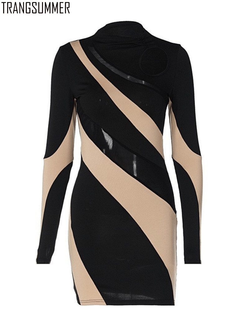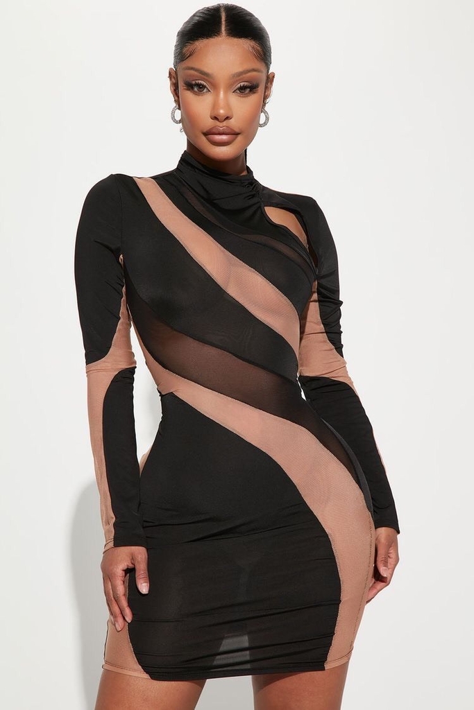 Chiếc đầm body ngắn trên gối tay dài thun mix lưới cut-out lượn theo cơ thể giúp khoe body nóng bỏng.