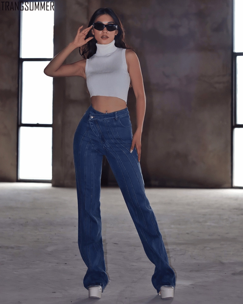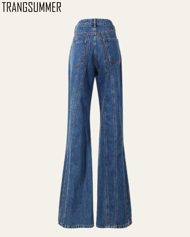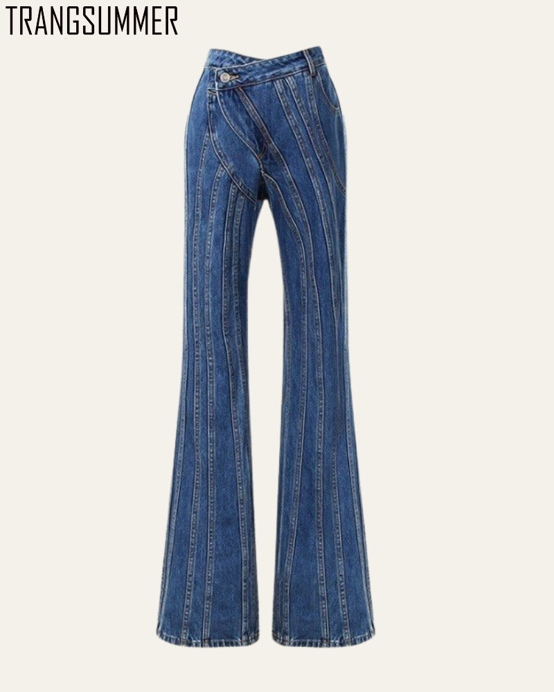 Quần jeans suông với các đường vải cách điệu chạy dọc quần, lưng cao push mông, phom quần loe nhẹ từ đầu gối xuống hack chân thon dài cực đỉnh.