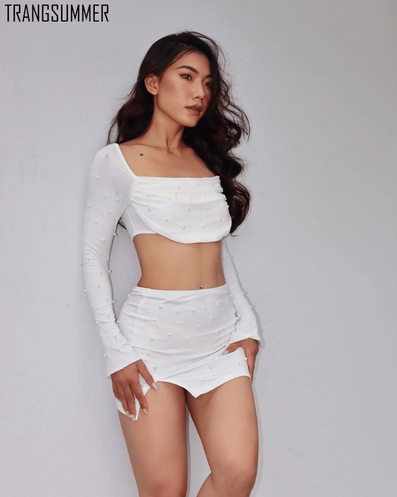 Set váy body đính hạt ngọc trai siêu sang, thiết kế trễ ngực khoe vòng một hấp dẫn.