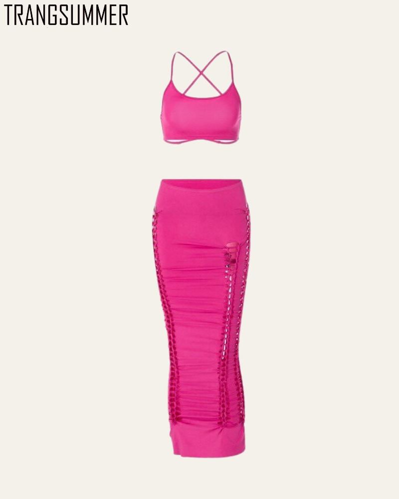 Set váy body dài với thiết kế áo croptop dây hở lưng siêu sexy, dáng váy dài được nhấn nhá bằng những đường cut-out táo bạo dọc theo sườn váy cùng phom ôm body tôn đường cong nóng bỏng.