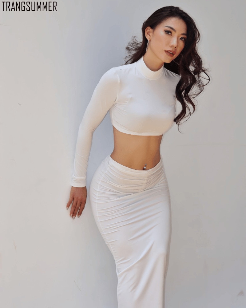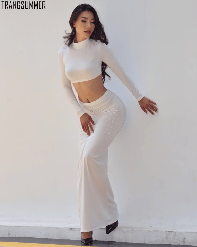 Sét váy body dáng dài với chiếc áo croptop cổ cao tay dài, cùng chân váy dài ôm sát body tôn trọn đường cong cơ thể.