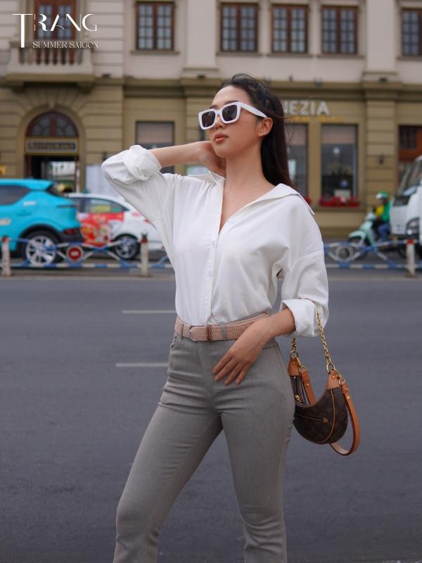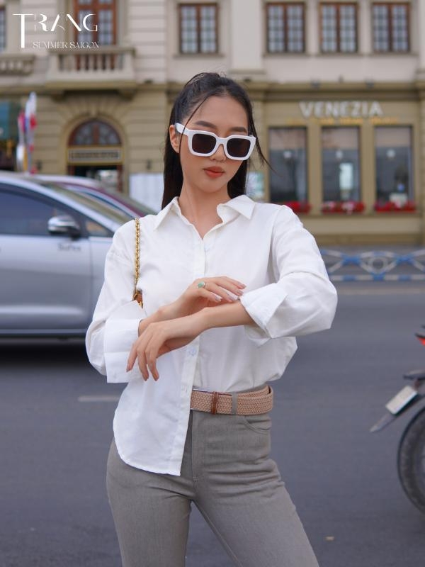 Chất liệu: Áo sơ mi trắng cotton, quần xám jeans.