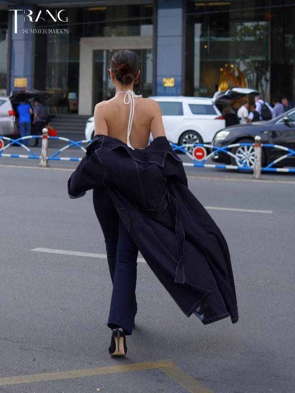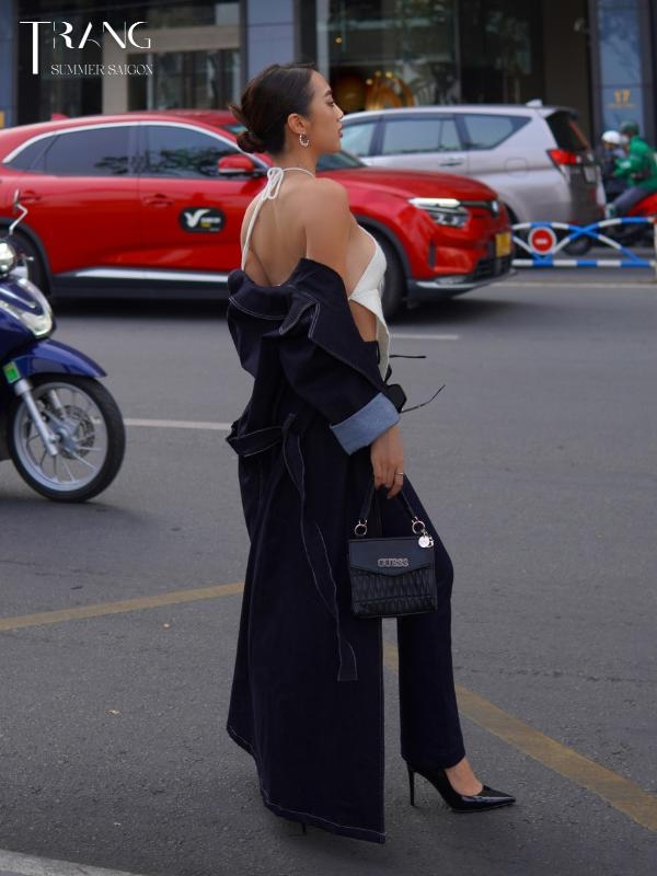 Mix and match dạo phố cực chất với manto jeans xanh đen kết hợp cùng áo len cổ yếm mix lưới với các đường cắt xẻ táo bạo, thiết kế hở lưng khoe vai trần gợi cảm và quần Jeans lưng cao.