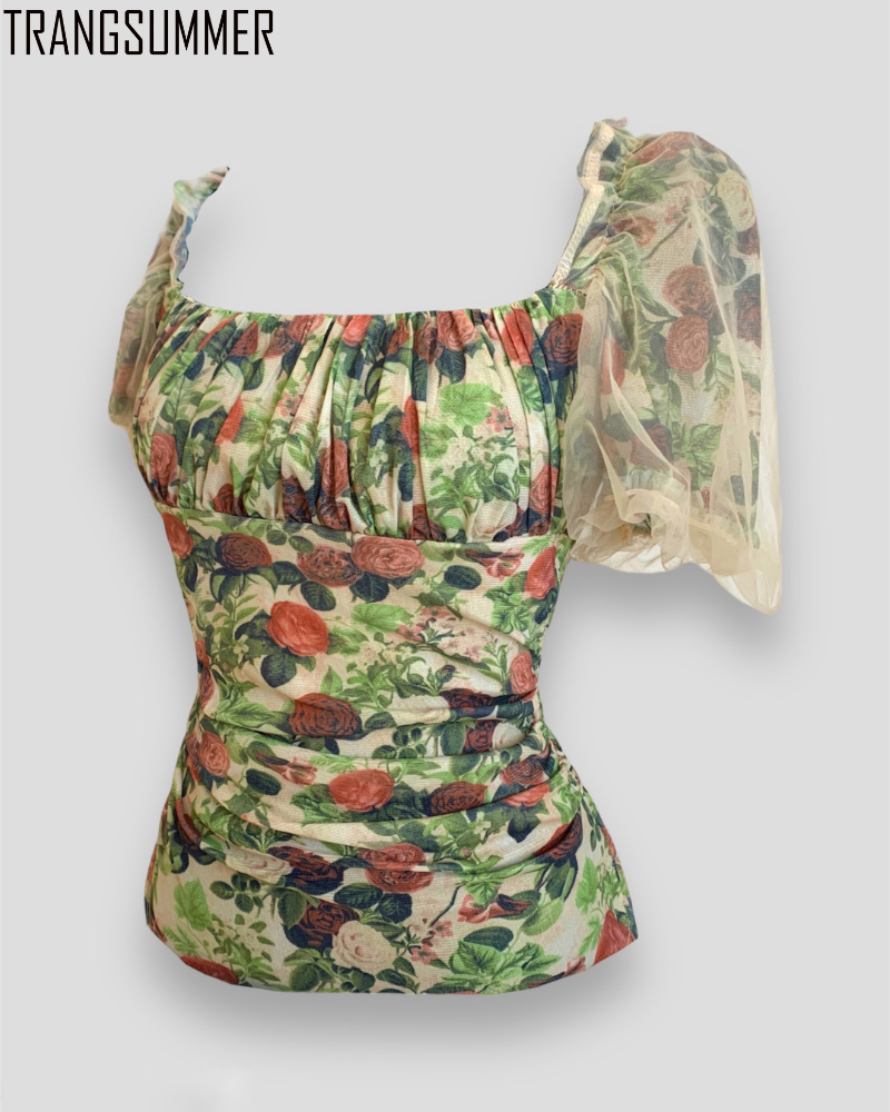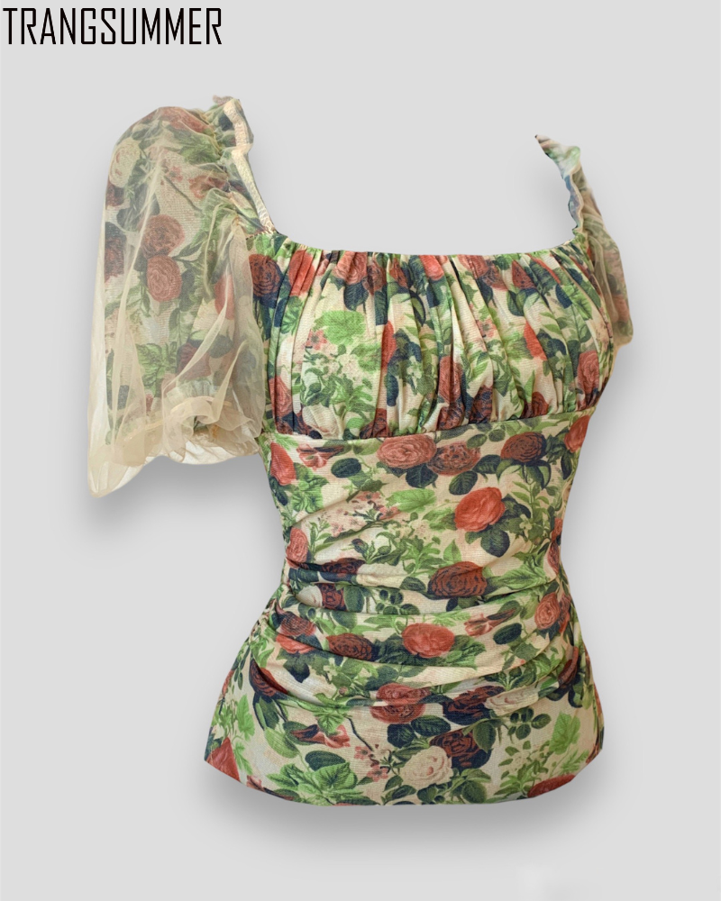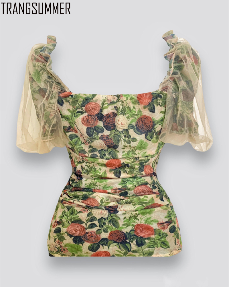 Áo croptop lưới hoa hồng tay ren phồng sexy cổ điển.