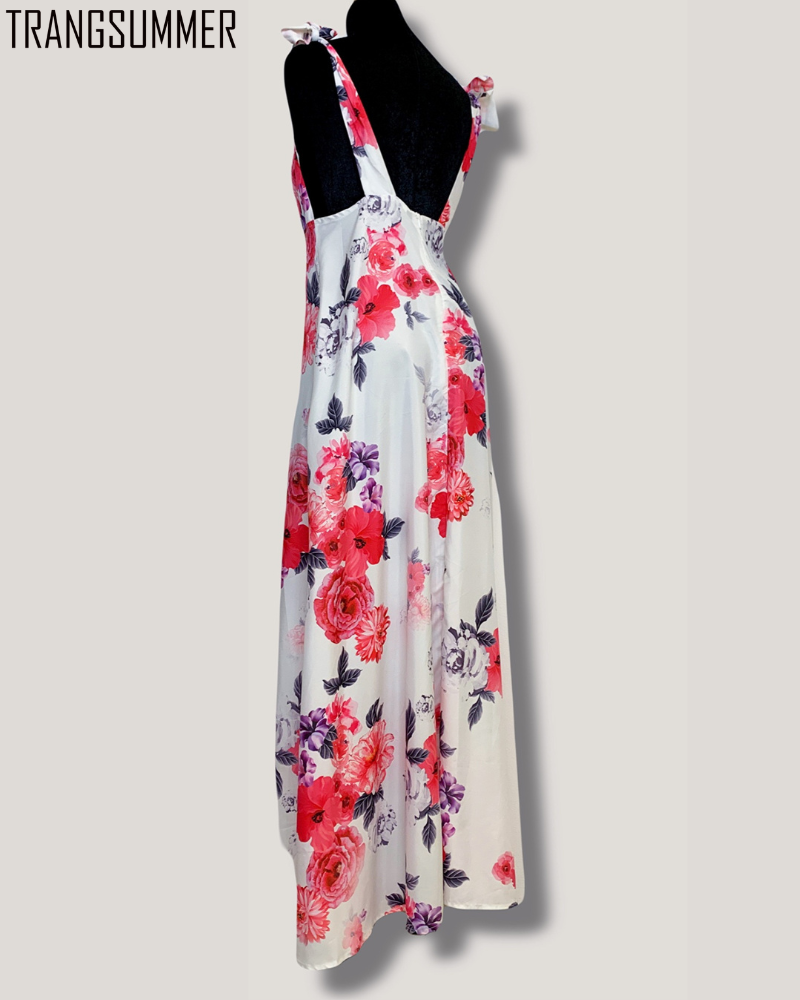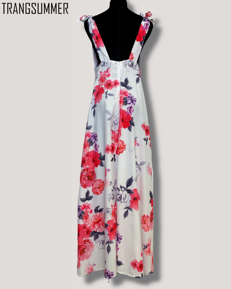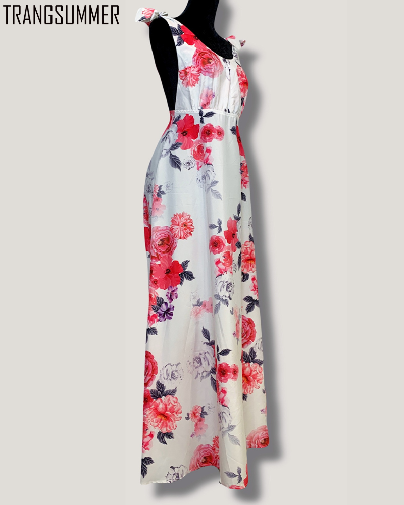 Đầm maxi trắng hoa dâm bụt hai dây cột dây thích hợp cho chuyến du lịch biển, dáng xòe cho bạn thoải mái vận động.