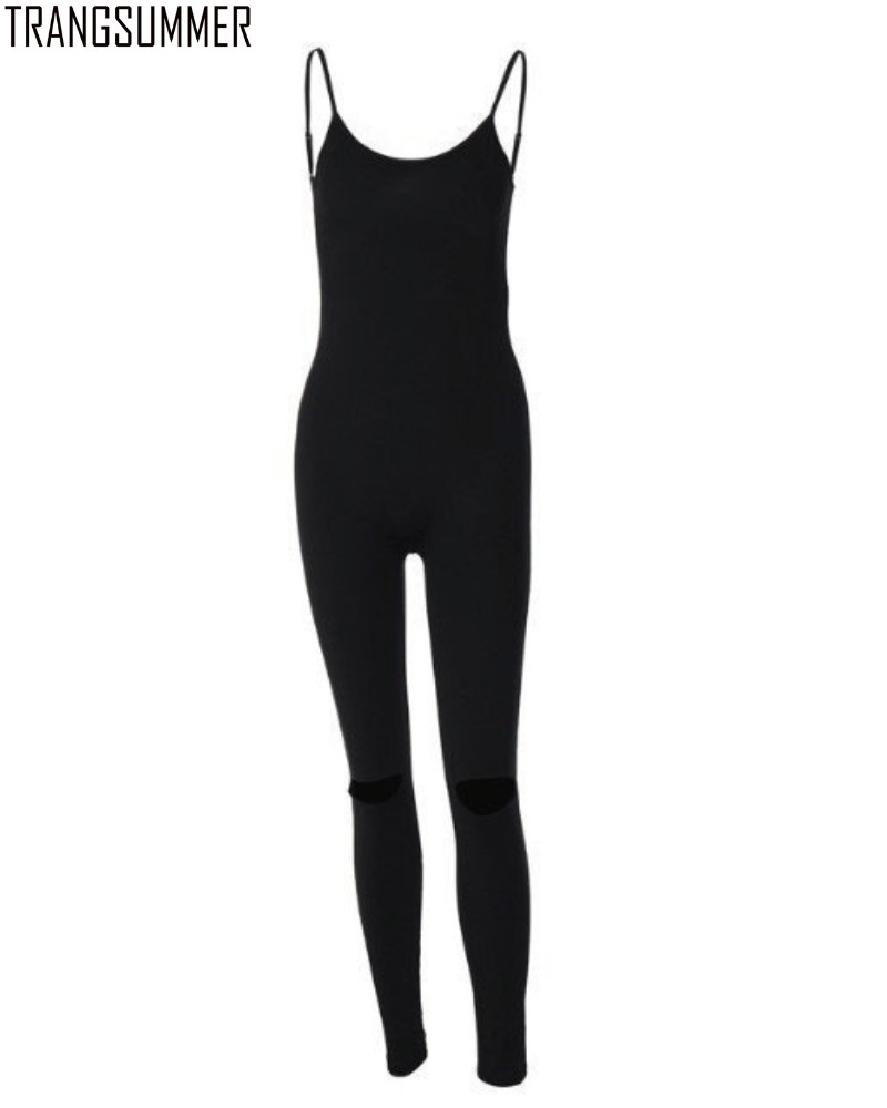 Chiếc jumpsuit hai dây màu đen basic hở lưng giúp tôn đường cong nóng bỏng và rất thuận tiện trong việc di chuyển hằng ngày, kiểu rách gối cho bạn thật cá tính và năng động.
