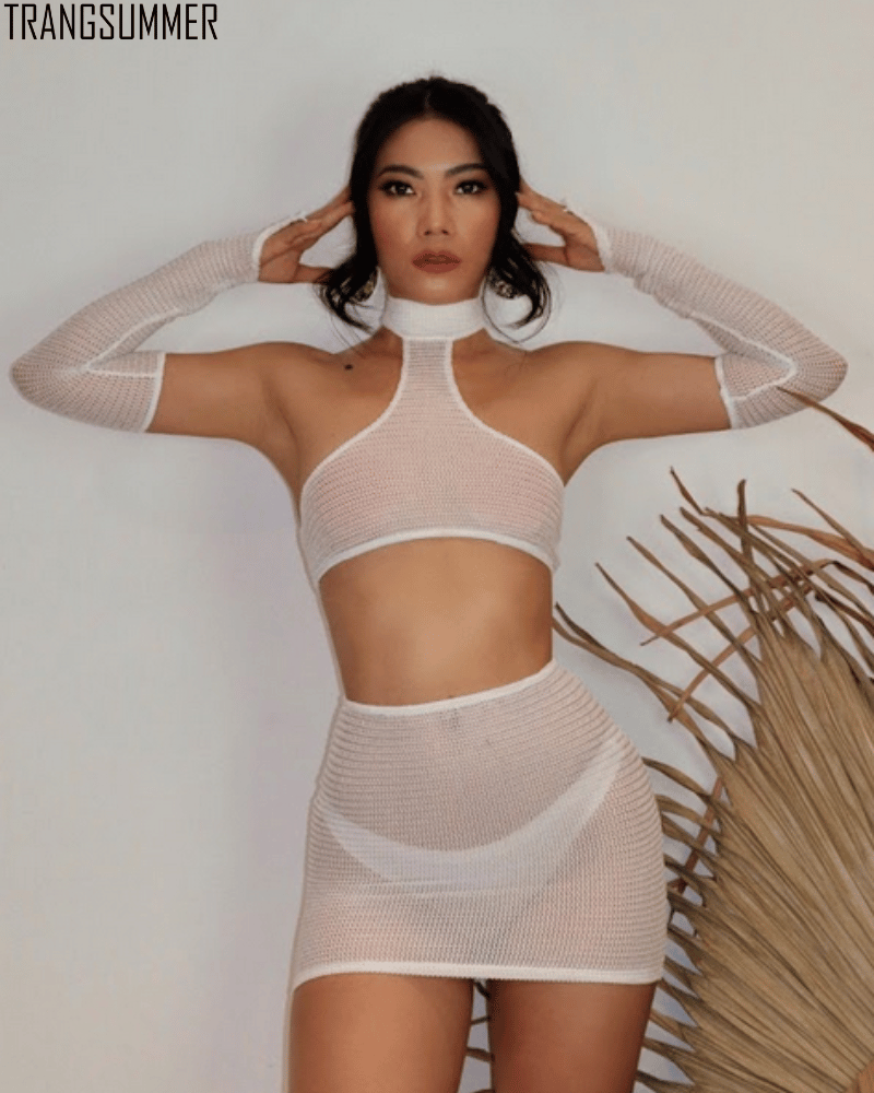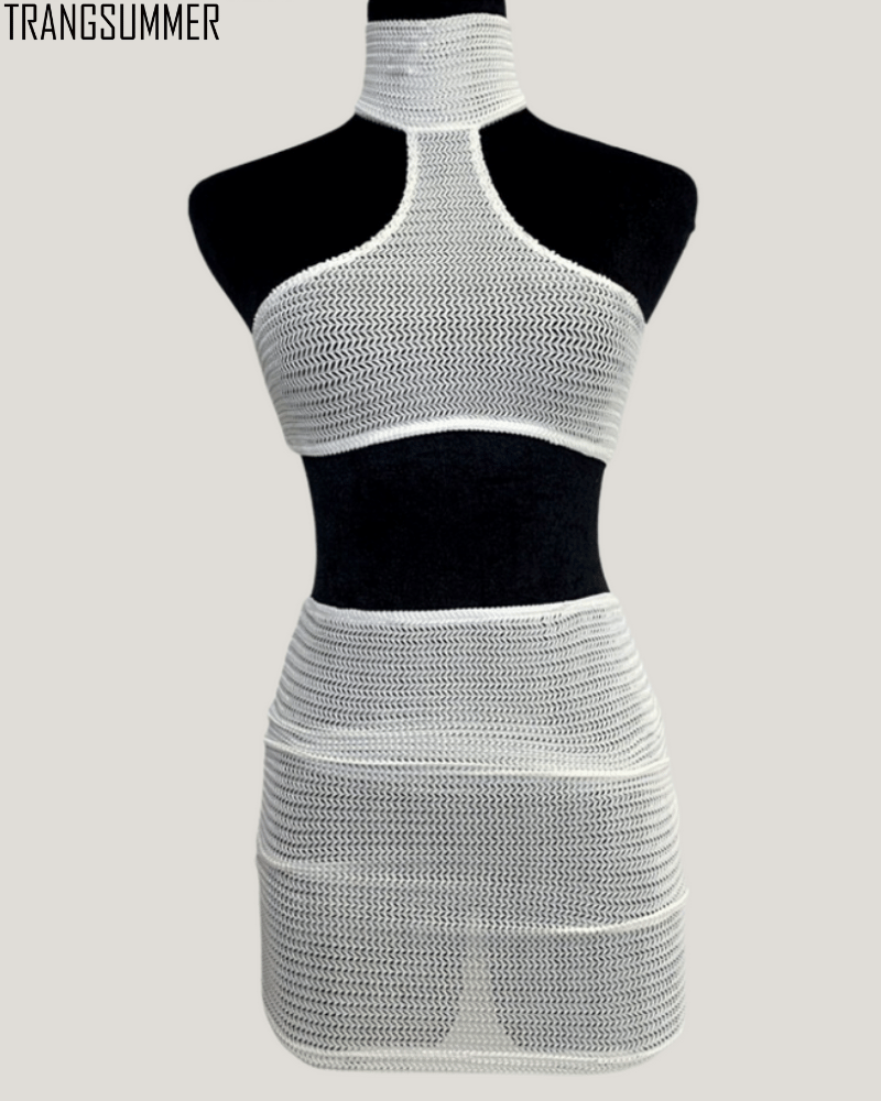 Set váy body áo croptop cổ yếm kèm bao tay lưới siêu sexy.